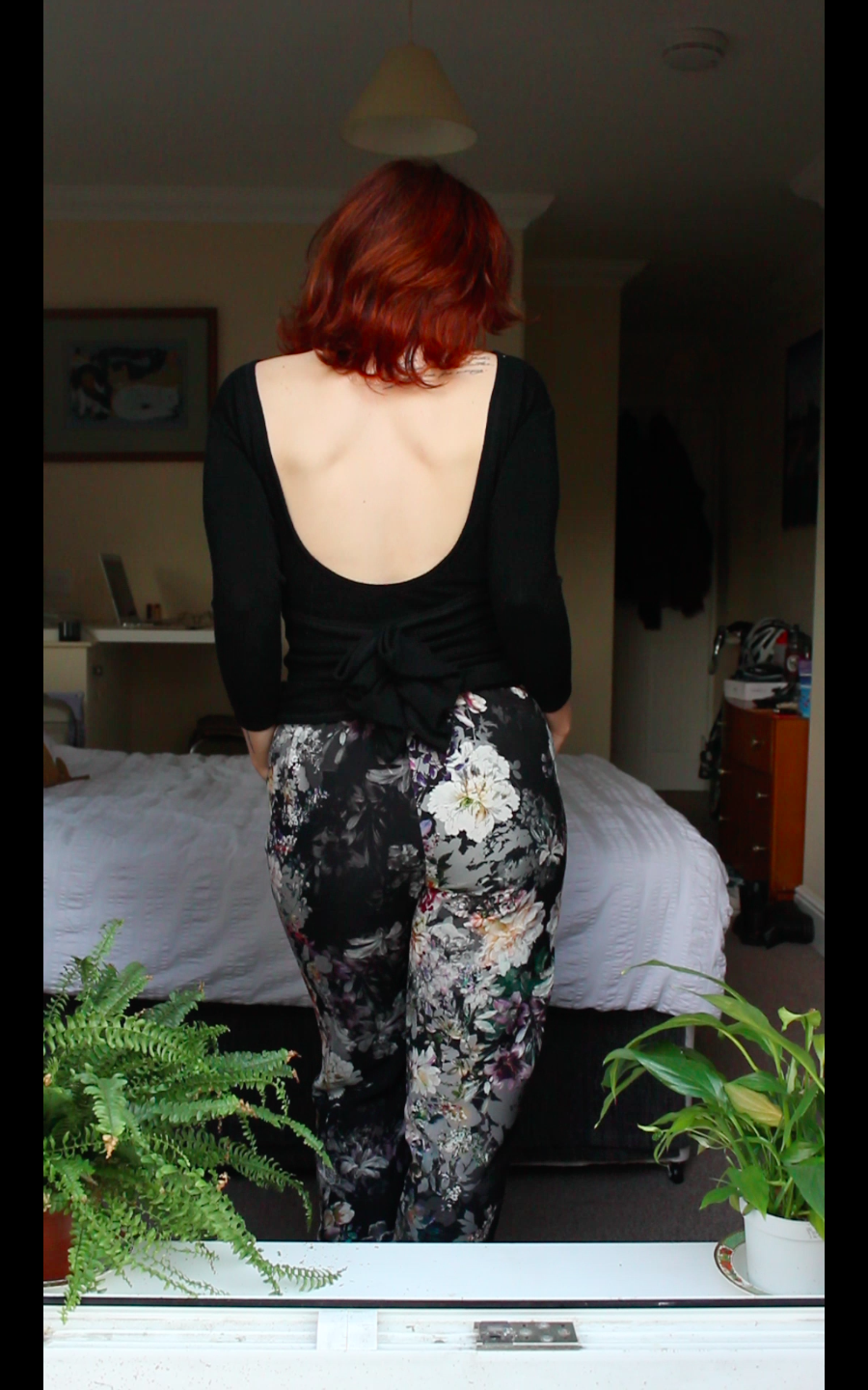 My floral trousers (River Island 2014) which I bought for my first day at Vogue. Paired with backless vintage top (vintage shop £30)